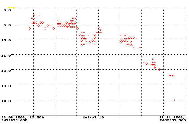 Im letzten Rundbrief berichtete ich vom beginnenden Abfall dieses RCRB Sterns. Das Minimum von 14.8 mag wurde in den Tagen um den 20. September erreicht. Danach begann ein sanfter und stufenartiger Anstieg auf 13.5 mag in der ersten Novemberhälfte.