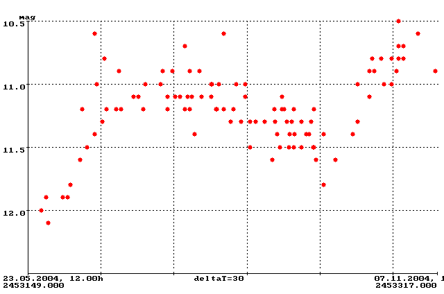 FG Sge beendete in diesem Sommer ein langwierige Phase verminderter Helligkeit und erreichte erstmals seit April 2001 wieder eine Helligkeit von 11 mag. Wie auch während der letzten hellen Phase sind bereits jetzt wieder quasi-periodische Schwankungen in einem Zeitraum von 100 Tagen erkennbar. So gab es nach dem Maximum Mitte Juli einen Einbruch auf 11.7 mag Ende September und anschließend einen erneuten Anstieg auf 10.8 mag bis Ende Oktober. Die Lichtkurve in Abbildung 6 stellt den bisherigen Verlauf der hellen Phase von FG Sge dar.